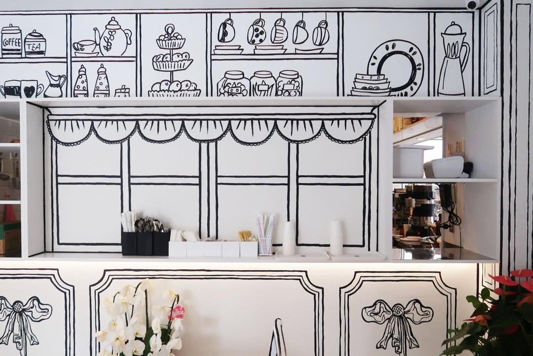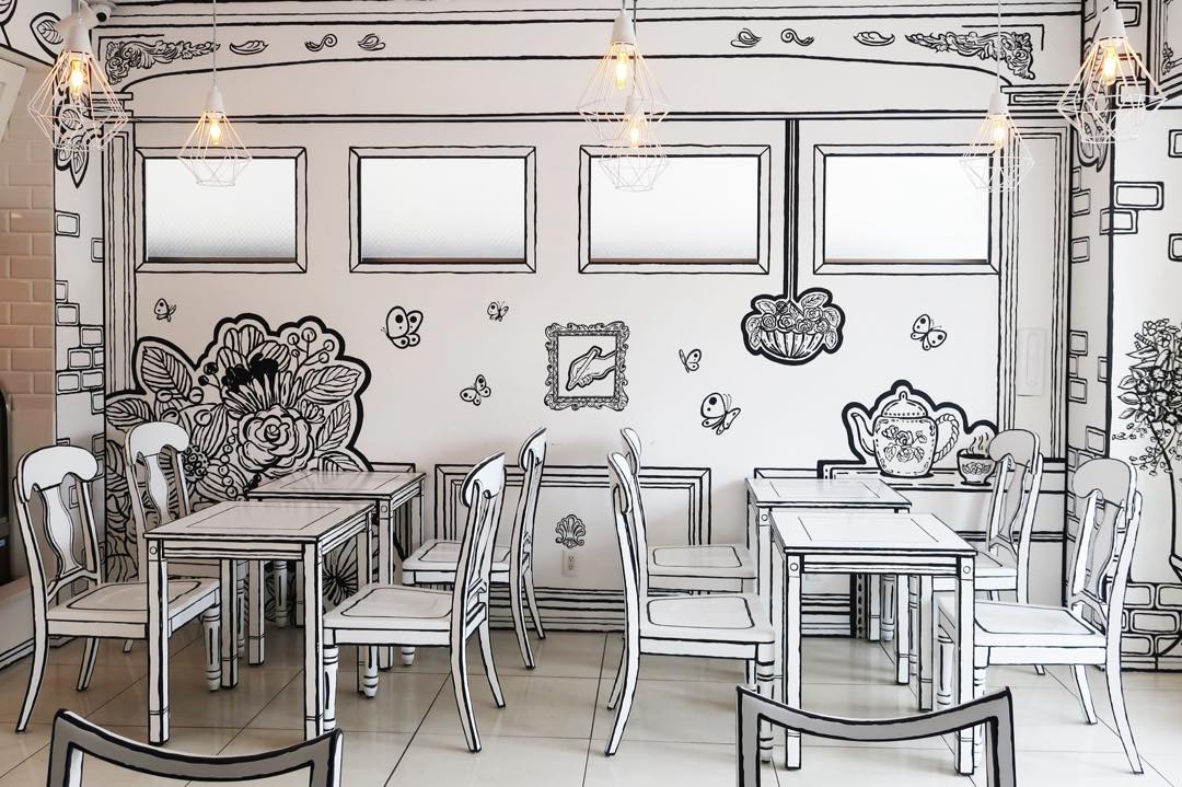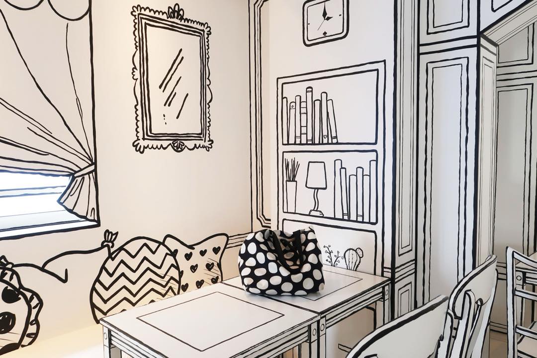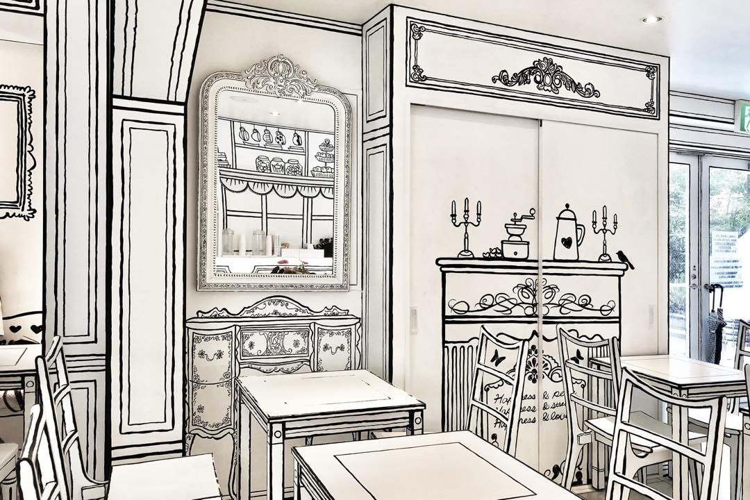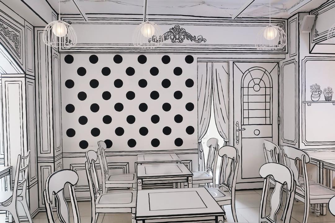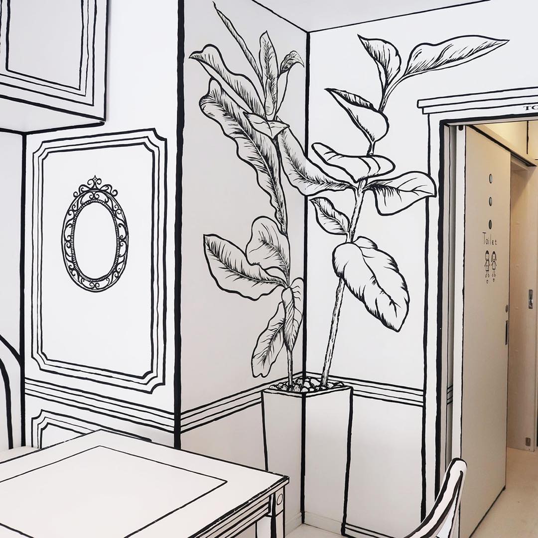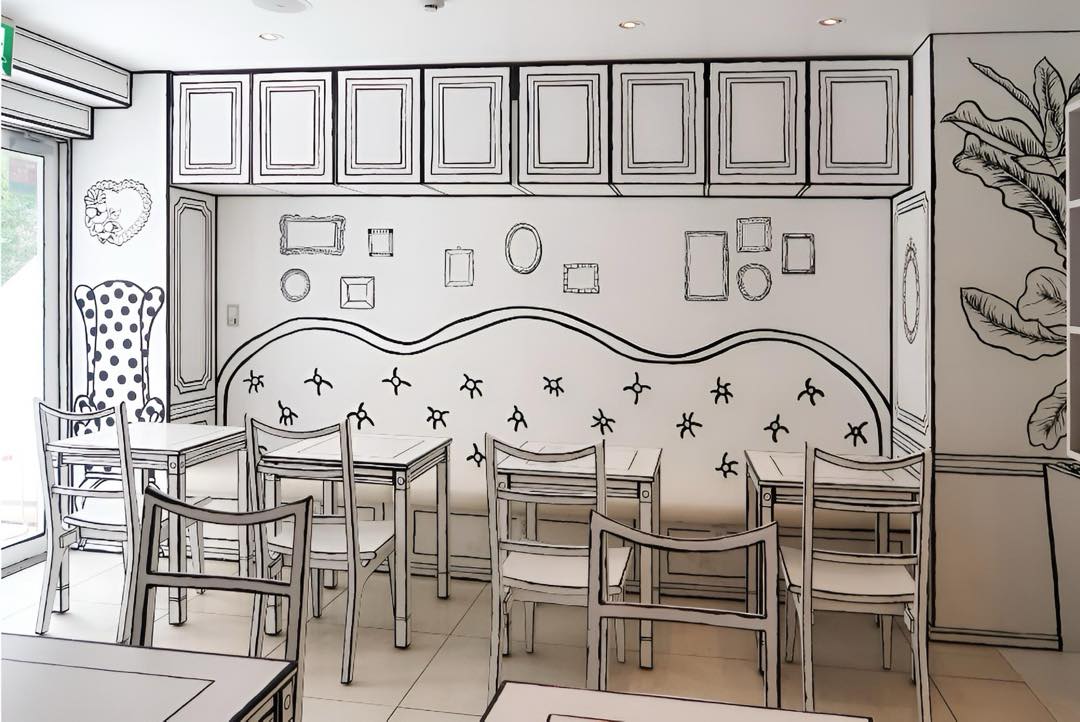 店内のインテリアがすべて黒の線で描かれた絵の世界です。