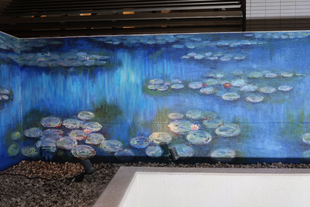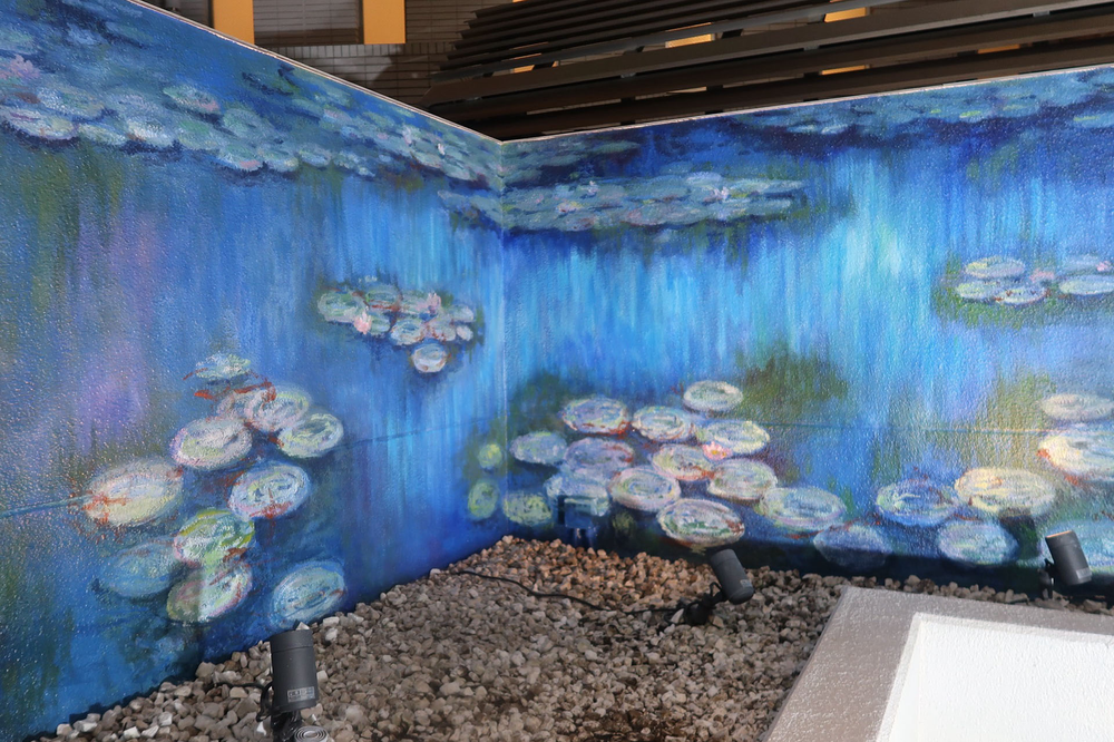 店内奥のウッドデッキのオープンスペースの壁面に一面ブルーの「睡蓮の池」の絵を描きました。